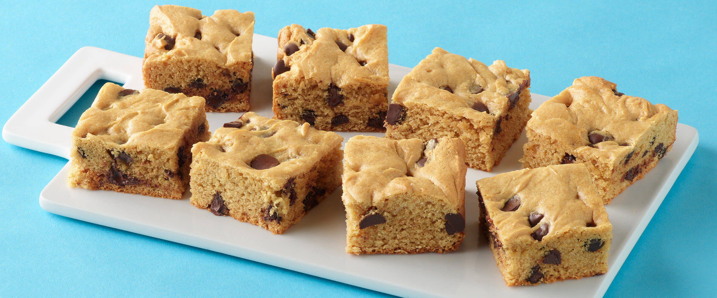 These SKIPPY® Easy Peanut Butter Cookie Bars are a quick and delicious treat perfect for any occasion. The rich, creamy flavor of SKIPPY® Peanut Butter shines through in every bite, making these bars irresistibly tasty. Simply mix SKIPPY® Creamy Peanut Butter, butter, eggs, water, and yellow cake mix, then fold in chocolate chips and bake. Enjoy these golden, chewy bars as a delightful snack or dessert!